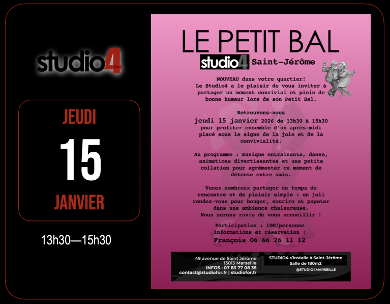Le Studio4 a le plaisir de vous inviter à partager un moment convivial et plein de bonne humeur lors de son Petit Bal.
